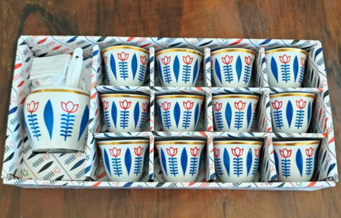 1 set of 12 ceramic coffee cups (5.1×6.5 cm), a sugar pot (5.1×6.5 cm), and a spoon in blue colour, gold line and red tulip.